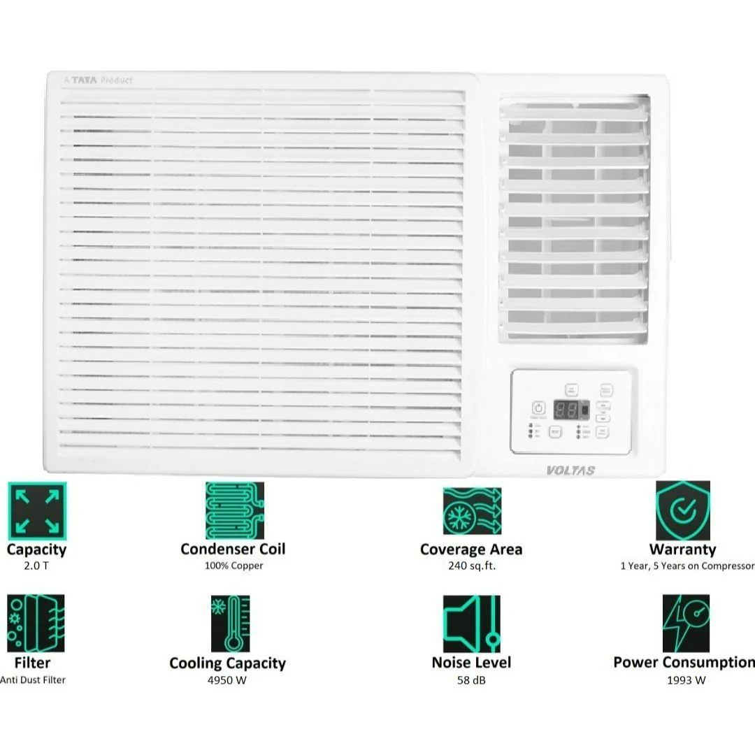 Witness the chilled temperature inside your room when you buy Voltas Vectra 2 Ton 2 Star Fixed Speed Window AC online. Its 2-ton capacity makes it a great option for large areas. Its high EER rotary compressor ensures lasting performance. Using the eco-friendly refrigerant R-32 in this unit is a plus for optimum cooling effect. For long-term use and good cooling performance, this air conditioner is equipped with a copper condenser. Turbo mode helps the air conditioner reach the desired temperature effectively. Get a comfortable environment by bringing home the Voltas Vectra 2 Ton 2 Star Fixed Speed Window AC online. This AC has been designed to provide maximum comfort. Considering the amazing specifications, the ltas Vectra 2 Ton 2 Star Fixed Speed Window AC’s price is quite fair. This air conditioner has a dust filter in the indoor unit. This traps airborne dust as it passes and prevents it from interfering with internal mechanisms. This air conditioner’s self-diagnostic feature helps in troubleshooting. Sleep settings lower the temperature for a good night’s sleep. So, what are you waiting for? Book the Voltas Vectra 2 Ton 2 Star Fixed Speed Window AC online, right away.